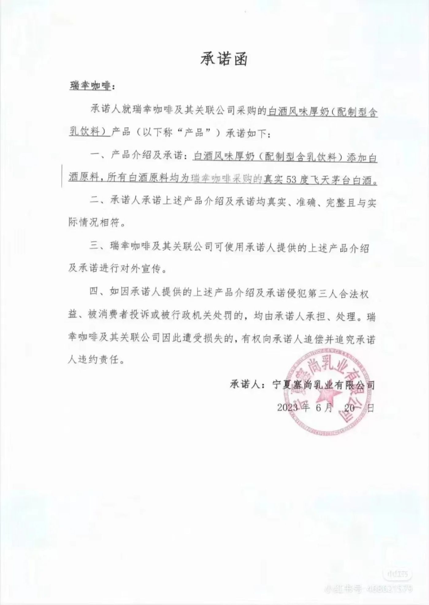 从目前的舆论反馈来看,“酱香拿铁”颇具冲击力的口味对白酒的模仿总体而言得到了广泛认可,对于“白酒风味厚奶”就是“加香精”的质疑,供应商宁夏塞尚乳业发布《承诺函》称所有白酒原料均为瑞幸采购的真实53度飞天茅台白酒,并加盖公章,为争议“盖棺定论”。