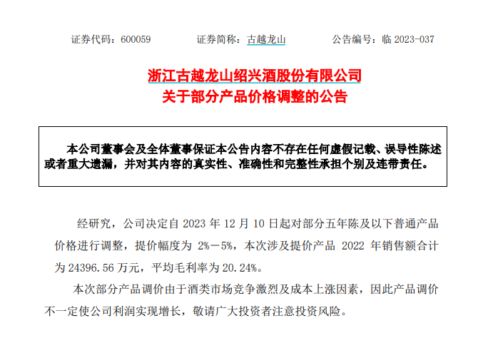 公告显示,古越龙山决定自2023年12月10日起,对部分五年陈及以下普通产品价格进行调整,提价幅度为2%-5%。本次涉及提价产品2022年销售额合计为2.4亿元,平均毛利率为20.24%。
