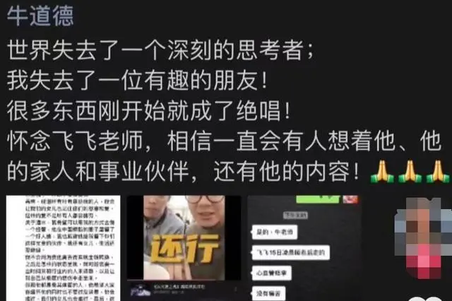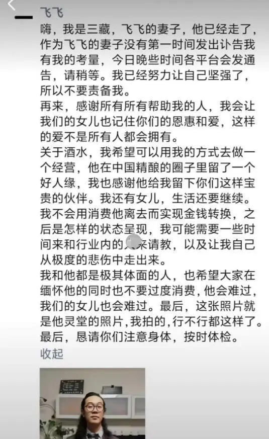 4月17日,备受关注的网络品鉴大师“飞飞一杯酌”在其全平台账号上发表了出人意料的告别声明!公告中充满了哀痛之情,揭示了博主任飞,即“飞飞一杯酌”,在2024年4月15日午间,于河南省中医院因心脏病突发不幸离世,享年仅34岁。 任飞的一生丰富多彩,他从少年时期起就热爱生活,沉浸于品酒、绘画、交友,直至步入婚姻和成为父亲,每个阶段都与美酒相伴。他的专业品酒技能和深厚造诣,从其账号名称中便可见一斑,他对酒的热爱如痴如醉。 他曾说过:“品过千般佳酿,仍觉缺那一杯。”他不仅成为了众多酒友的知识启蒙者,更是他们的精神支柱。然而,他的突然离世让许多忠实粉丝难以接受。据透露,就在4月15日下午四点,任飞还发布了最新的视频动态。 然而,这份讣告揭示,那是在他离世前的最后时刻。显然,这是一条存档视频。对此,任飞的妻子也在其个人社交平台上表达了看法,她解释说,由于个人原因,她在丈夫离世后未能立即发布讣告,希望大家能理解。她感谢所有给予支持的人,并承诺会将大家的关爱传递给他们的女儿,让她铭记这份深情厚谊。 尽管任飞离开了,但他在中国精酿界留下的良好口碑将会延续。他的妻子表示,将以自己的方式继续经营与酒相关的事宜,借助丈夫在业内的广泛人脉,寻求专业人士的指导,以独特的方式呈现未来的分享内容,让他的影响力得以延续。 她坚决反对利用逝者来追求物质收益,呼吁大家在怀念飞飞的同时,保持理智,避免过度消费,以免引发不必要的悲伤情绪。她在结尾部分表达了对大家健康的关心,强烈建议定期进行体检。 飞飞的朋友也在社交媒体上发表了哀思,揭示了飞飞离世的具体原因——他在沉睡中因心血管问题骤然离世,过程平静无痛。 浏览飞飞的账号,尽管他对酒精抱有浓厚兴趣,但他深知健康的重要性,尤其是作为已婚人士和一个乖巧可爱的女儿的父亲,他非常注重定期检查。 体检结果显示一切正常,他在与网友交流时还透露,得知结果后心情稍有宽慰。他曾满怀喜悦地分享医生对自己的赞扬,认为自己的生活方式相当健康。然而,仅仅两年多后,他的突然离世让人心痛,他留下了爱妻和幼女,这真是人生的一大遗憾。 当时,许多粉丝还在他的动态下祈祷他能保持健康。飞飞的帖子不仅涵盖了对各类美酒的评测,更融入了与家人共享的温馨时刻,亲情洋溢。 有人曾好奇他如何教育孩子,飞飞幽默地解释,只是让她闻闻酒香。他的回答赢得了网友的赞美,一致认为他的女儿极其惹人喜爱。那时发布的女儿视频是2022年的,从视频中的她判断,大约三岁的年纪。 两年光阴匆匆流逝,她现今应已迈入五岁的阶段,却过早地被迫接纳生活中父亲缺席的严酷现实,这令人深感痛惜。我们祈愿这位小小的生命能与母亲一同坚韧应对,以无比的勇气茁壮成长。同时,愿任飞的灵魂安息,他的精神永存! |